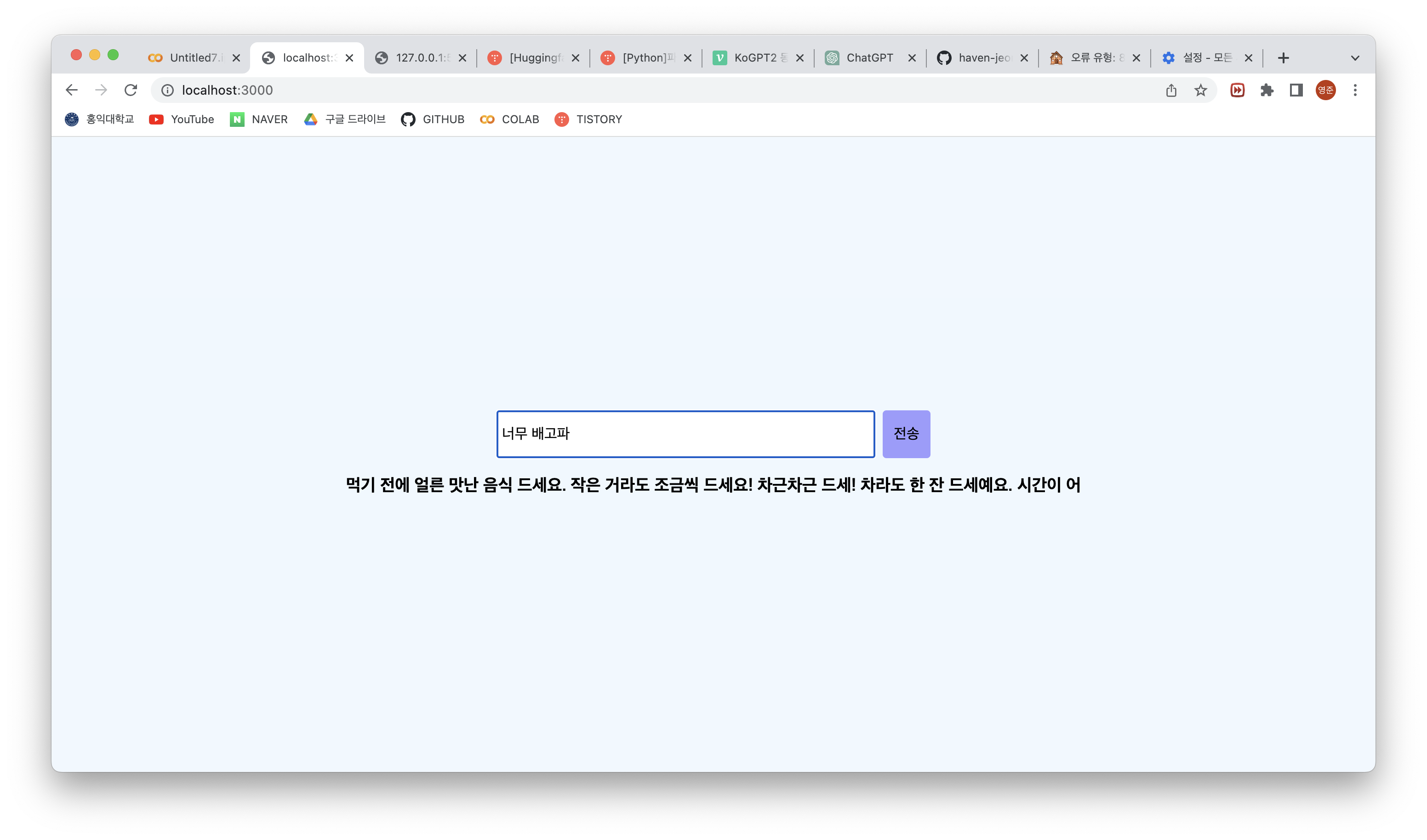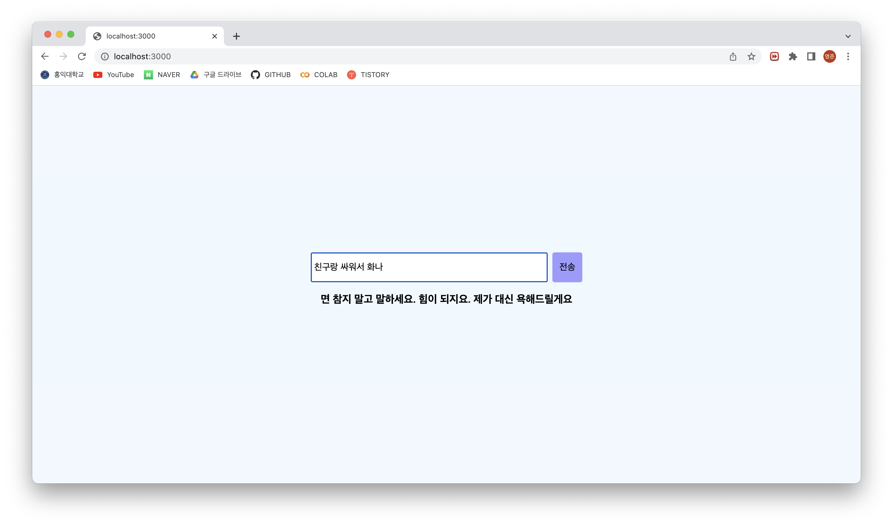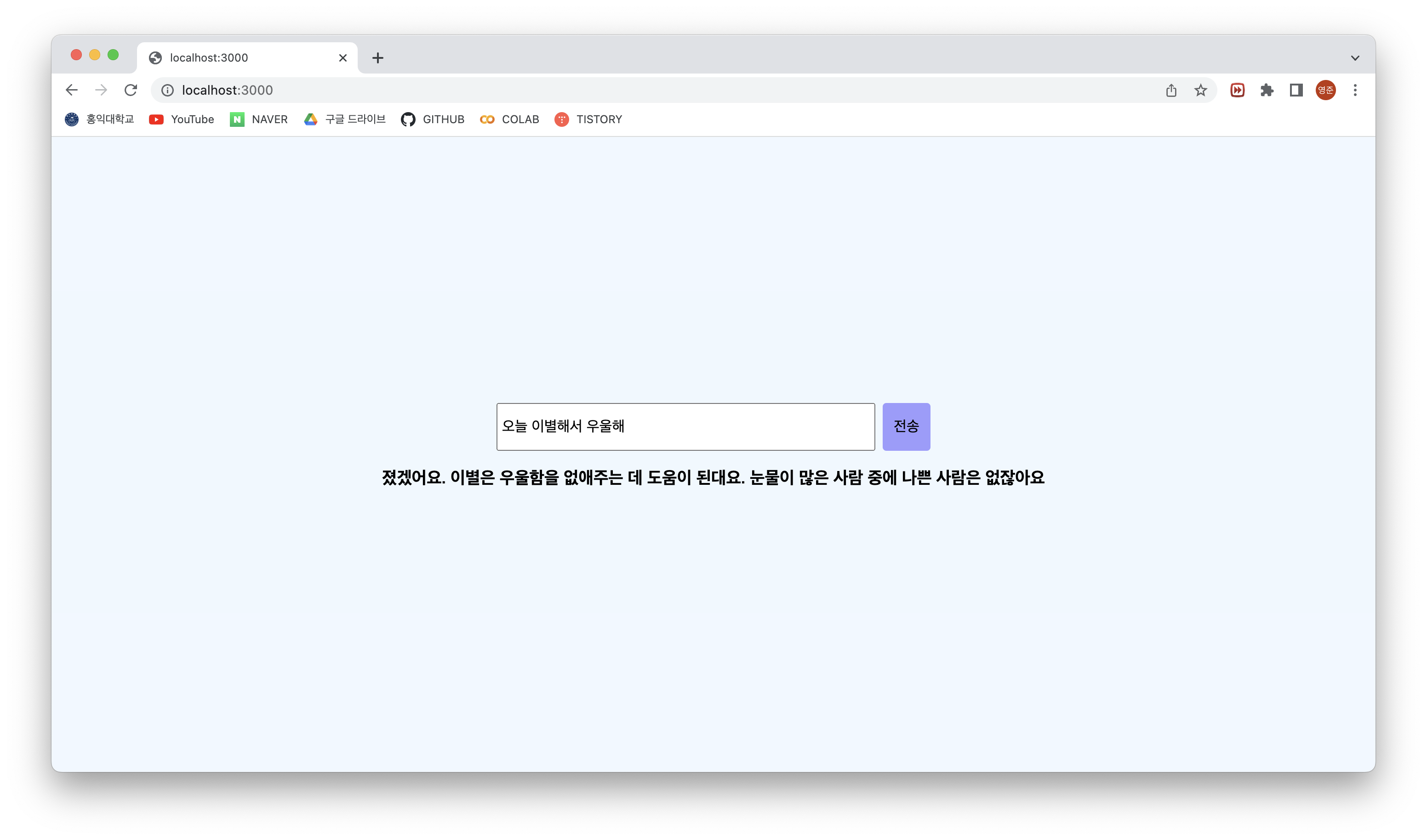 ์ด๋ฒ์ NLP๋ฅผ ์ฃผ์ ๋ก ์์ ํ ์ด ํ๋ก์ ํธ๋ฅผ ์งํํ๋๋ฐ, ์์ ์ ์ฌ๋ฆฌ๋ฅผ ์์ฑํ๋ฉด ๊ทธ๊ฒ์ ๊ณต๊ฐํด ์ฃผ๊ฑฐ๋ ์๋ดํด ์ฃผ๋ ์ฑ๋ด์ ๋ง๋ค์ด๋ดค๋ค.