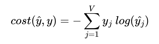 ์ค์ฌ ๋จ์ด์ one-hot vector๋ฅผ y๋ก ์ ์ํ์ ๋, ์ด ๋ ๋ฒกํฐ๊ฐ์ ์ค์ฐจ๋ฅผ ์ค์ด๊ธฐ ์ํด CBOW๋ ์์ค ํจ์(loss function)๋ก ํฌ๋ก์ค ์ํธ๋กํผ(cross-entropy) ํจ์๋ฅผ ์ฌ์ฉํ๋ค. cross-entropy ํจ์์ ์ค์ฌ ๋จ์ด์ one-hot vector์ ์ค์ฝ์ด ๋ฒกํฐ๋ฅผ ์ ๋ ฅ๊ฐ์ผ๋ก ๋ฃ๊ณ , ์ด๋ฅผ ์์ผ๋ก ํํํ๋ฉด ๋ค์๊ณผ ๊ฐ๋ค.