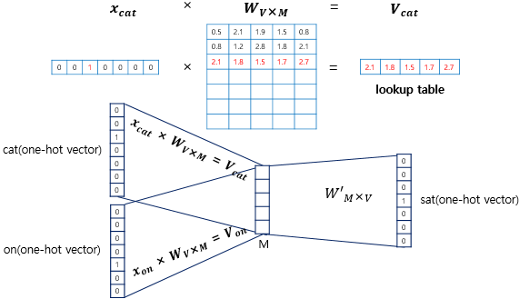 ์ฌ๊ธฐ์ V๋ ๋จ์ด ์งํฉ์ ํฌ๊ธฐ๋ฅผ ์๋ฏธํ๋ค (๋จ์ด ์งํฉ์ ๊ธธ์ด). ์ฆ, ์์ ๊ทธ๋ฆผ์ฒ๋ผ one-hot vector์ ์ฐจ์์ด 7์ด๊ณ , M์ 5๋ผ๋ฉด ๊ฐ์ค์น W๋ 7 × 5 ํ๋ ฌ์ด๊ณ , W'๋ 5 × 7 ํ๋ ฌ์ด ๋ ๊ฒ์ด๋ค.