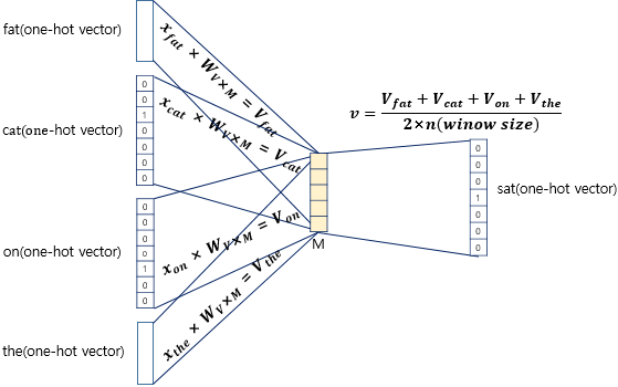 ์ด๋ ๊ฒ ์ฃผ๋ณ ๋จ์ด์ one-hot vector์ ๋ํด์ ๊ฐ์ค์น W๊ฐ ๊ณฑํด์ ์๊ฒจ์ง ๊ฒฐ๊ณผ ๋ฒกํฐ๋ค์ ํฌ์ฌ์ธต์์ ๋ง๋ ์ด ๋ฒกํฐ๋ค์ ํ๊ท ์ธ ๋ฒกํฐ๋ฅผ ๊ตฌํ๊ฒ ๋๋ค.