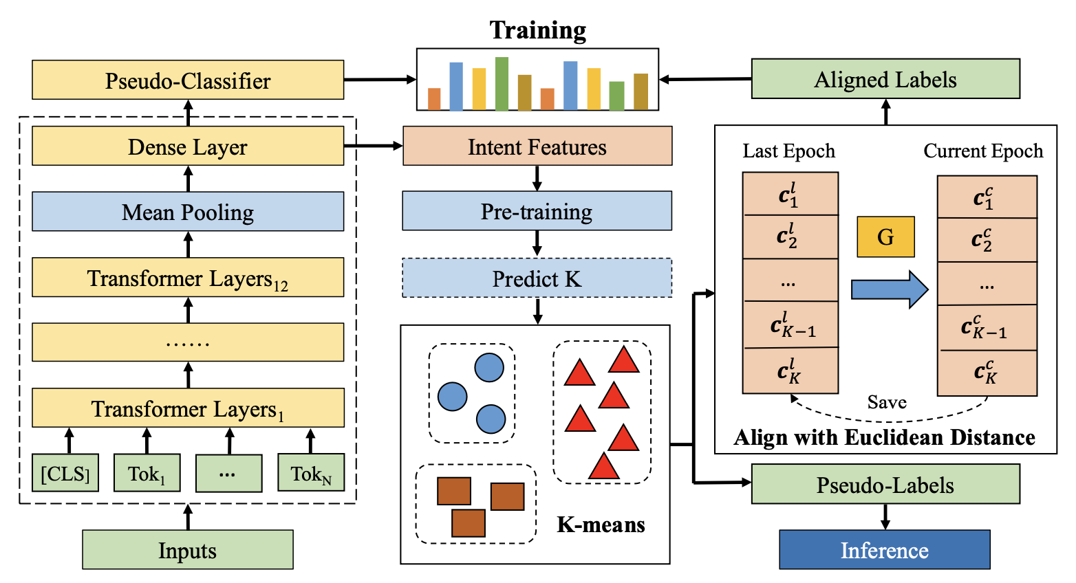 known intent๋ก๋ถํฐ knowledge๋ฅผ transfer ํ ํ, ์ด์ unlabeled known, novel classes๋ฅผ ์ฐพ๊ธฐ ์ํด clustering ์์ ์ ์ํํด์ผ ํ๋ค. ์ฐ์ ํด๋ฌ์คํฐ๋ง ํ cluster assignment์ centroid๋ฅผ ์ป๊ณ , self-supervised learning์ ์ํ ์ ๋ต์ ์คํํ๋ค.
