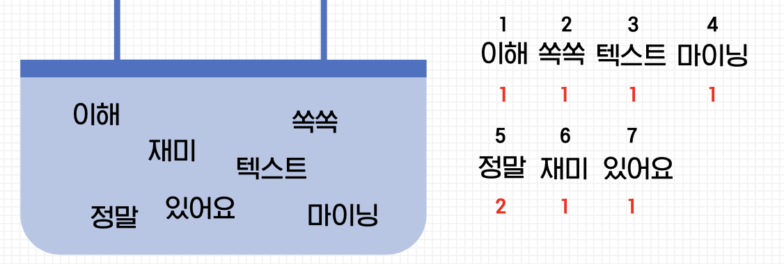 Bagμ λ΄κ³ κ° μΈλ±μ€μ μμΉμ λ¨μ΄ ν ν°μ λ±μ₯ νμλ₯Ό μμ±νλ©΄ λ€μκ³Ό κ°λ€:
